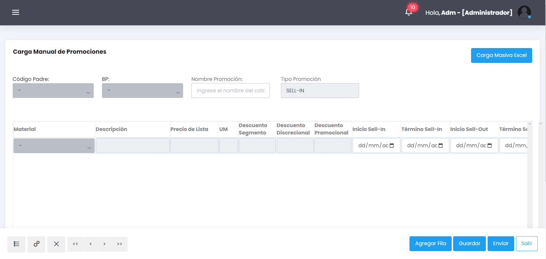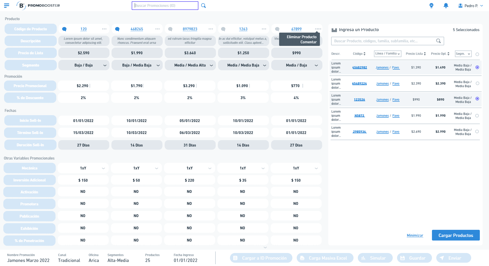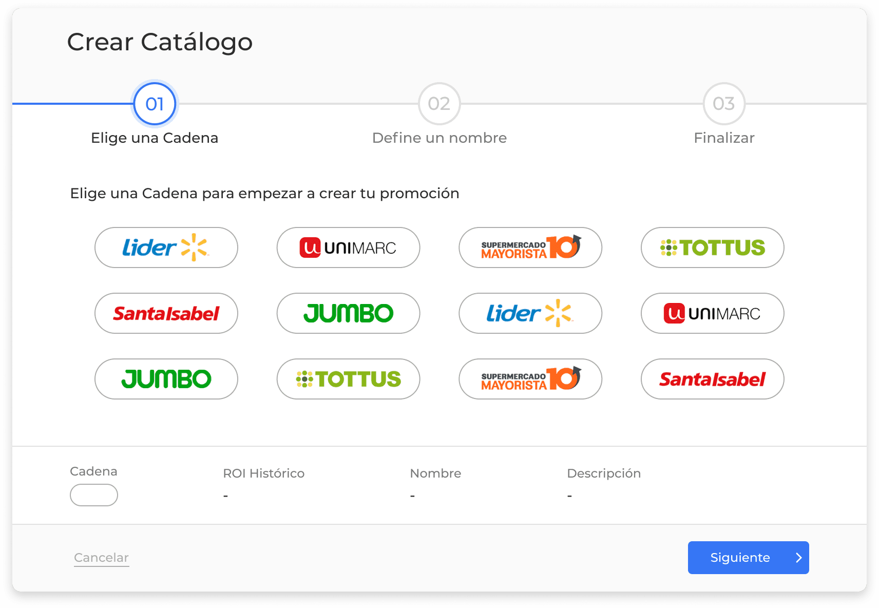Acá el usuario selecciona valores que no son modificables y que indican los datos a cargar desde el backend para cada promoción.