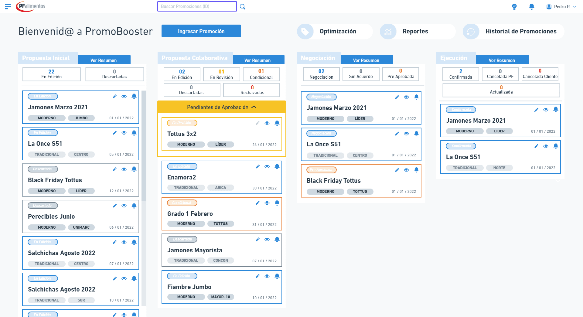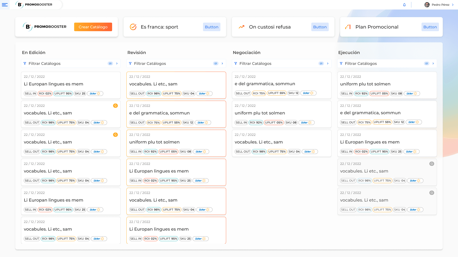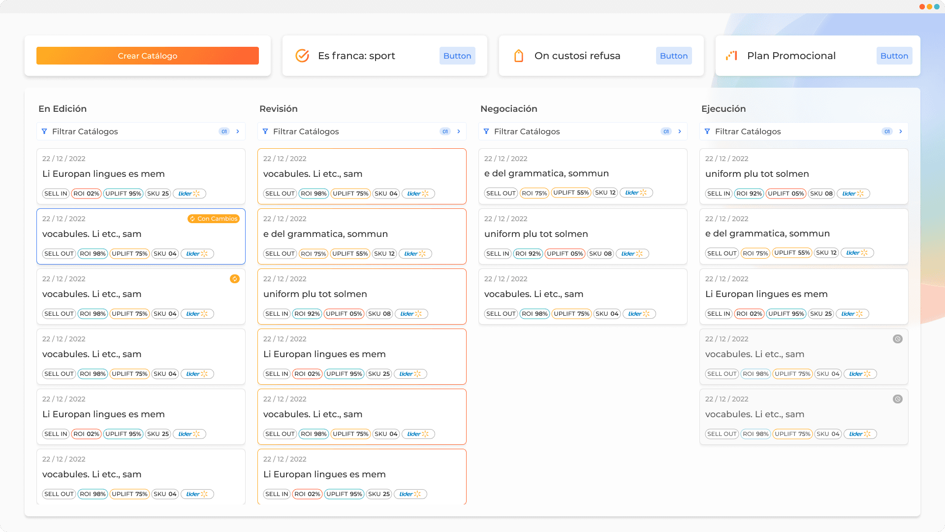Cada tarjeta dentro de las columnas representa una promoción o catálogo, y cuenta con indicadores de: