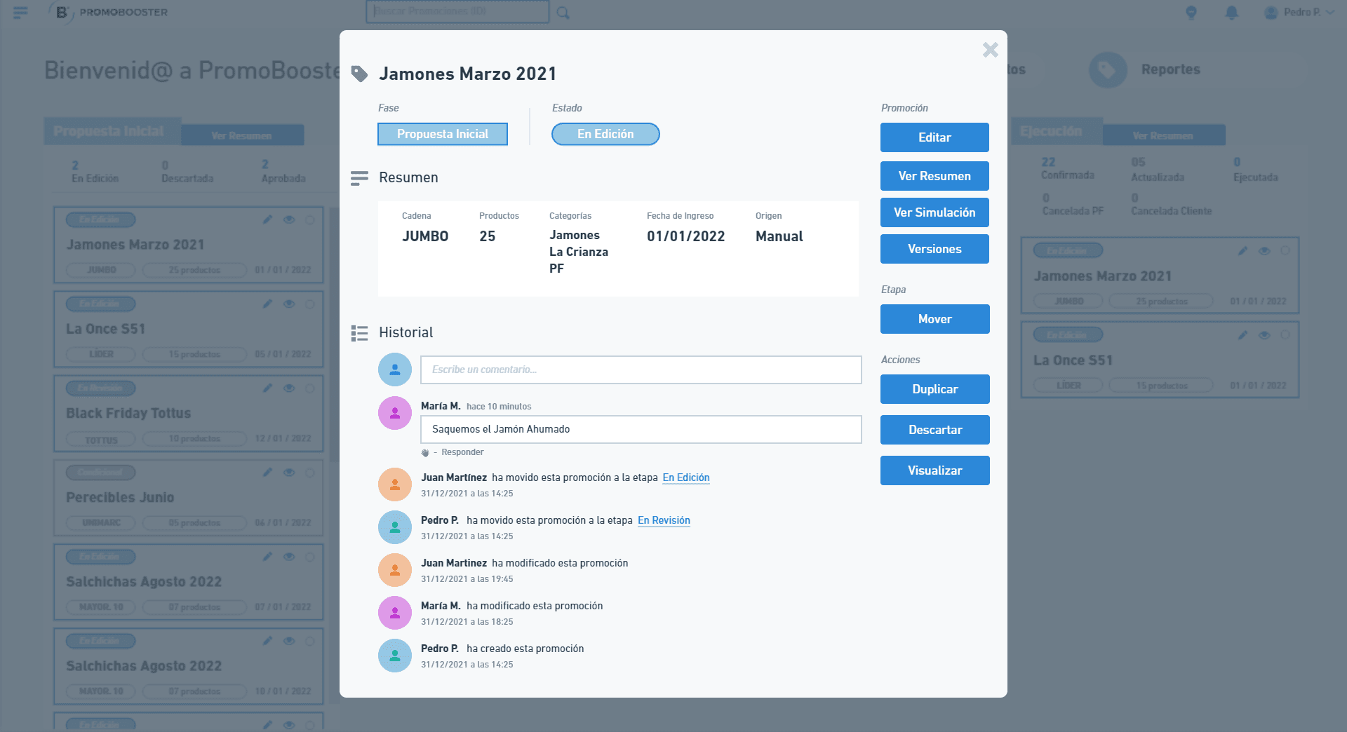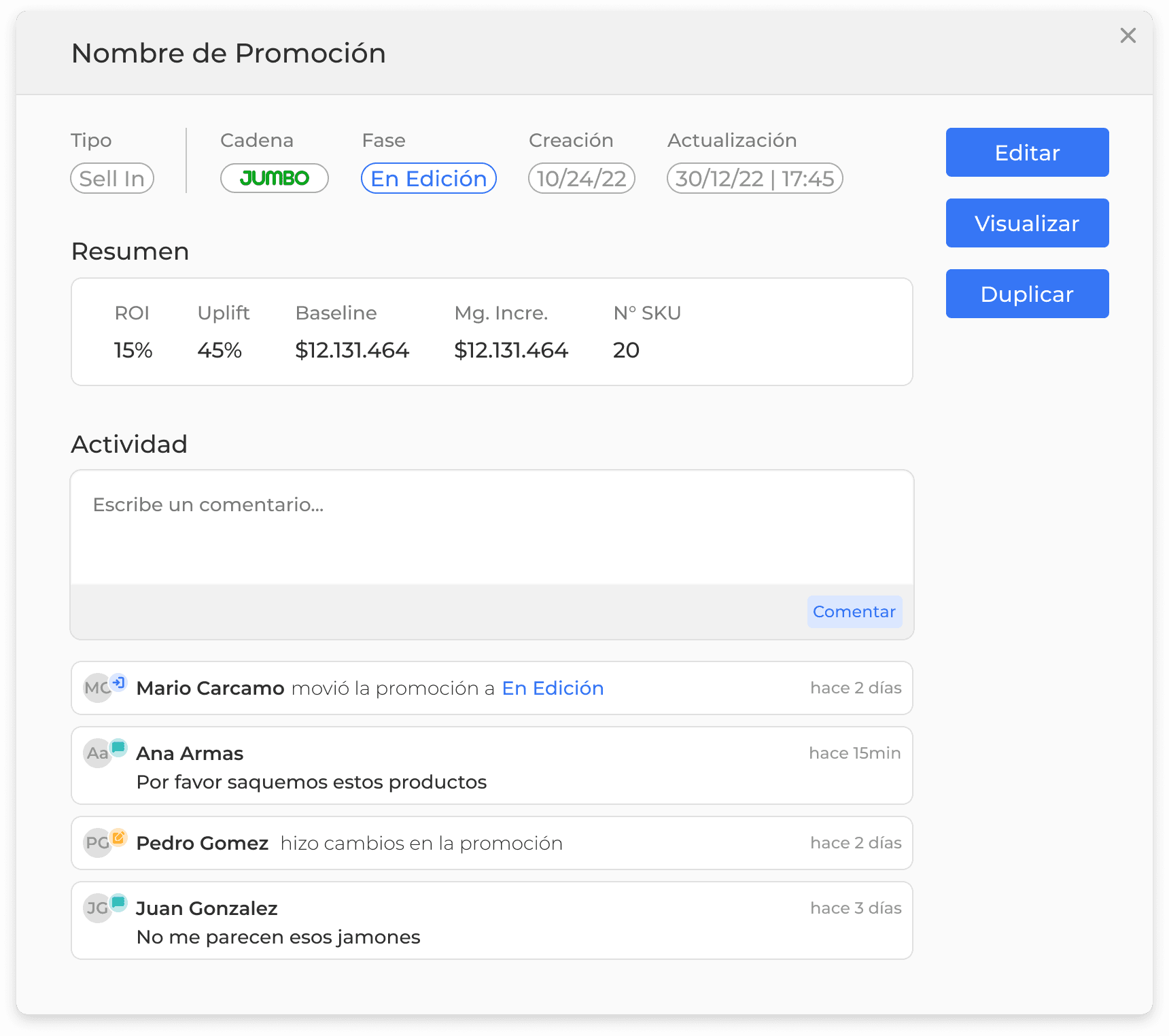 Contiene un resumen un poco más extenso de la promocion, los botones para acceder a ella o duplicarla y la ultima actividad que ha tenido la misma. Esta tarjeta se despliega haciendo click sobre cualquiera de las tarjetas en el home.