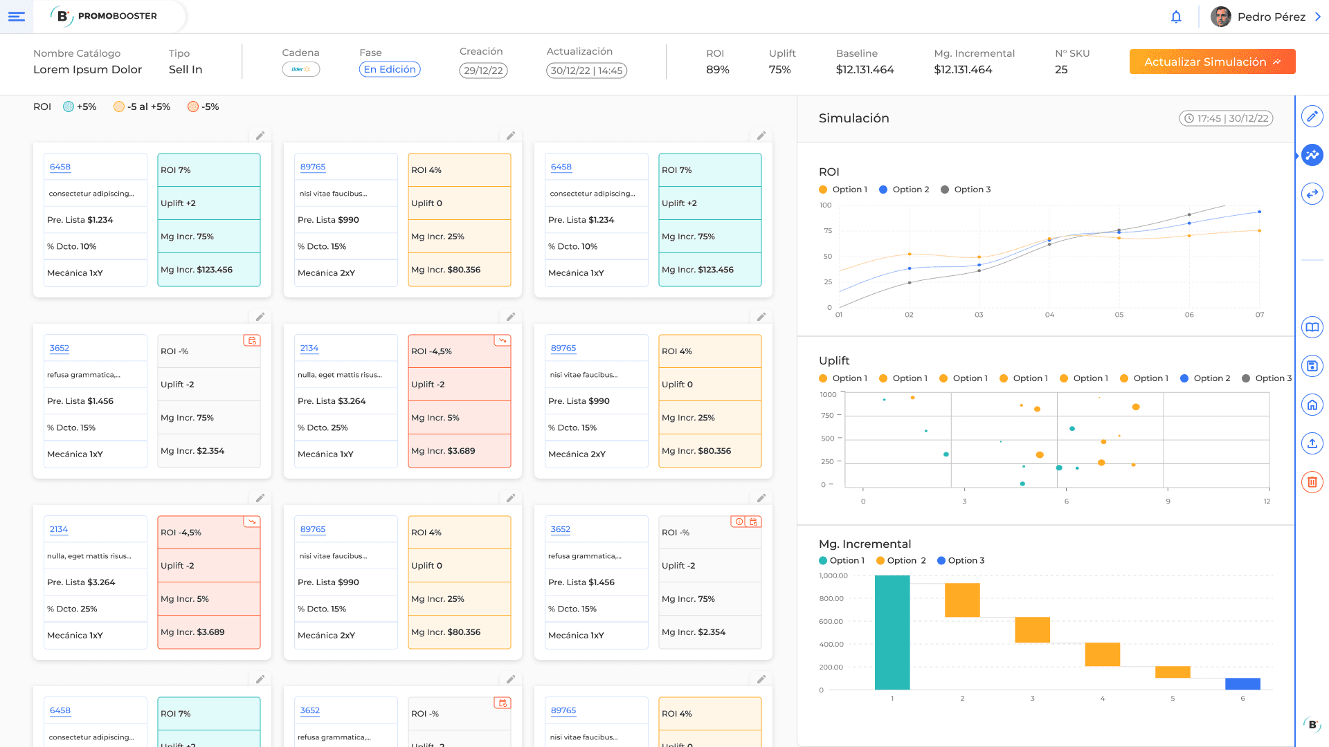 En esta vista se vacía el mayor valor de la aplicación. Acá se muestran los resultados de la simulación, tanto a nivel producto como a nivel general.