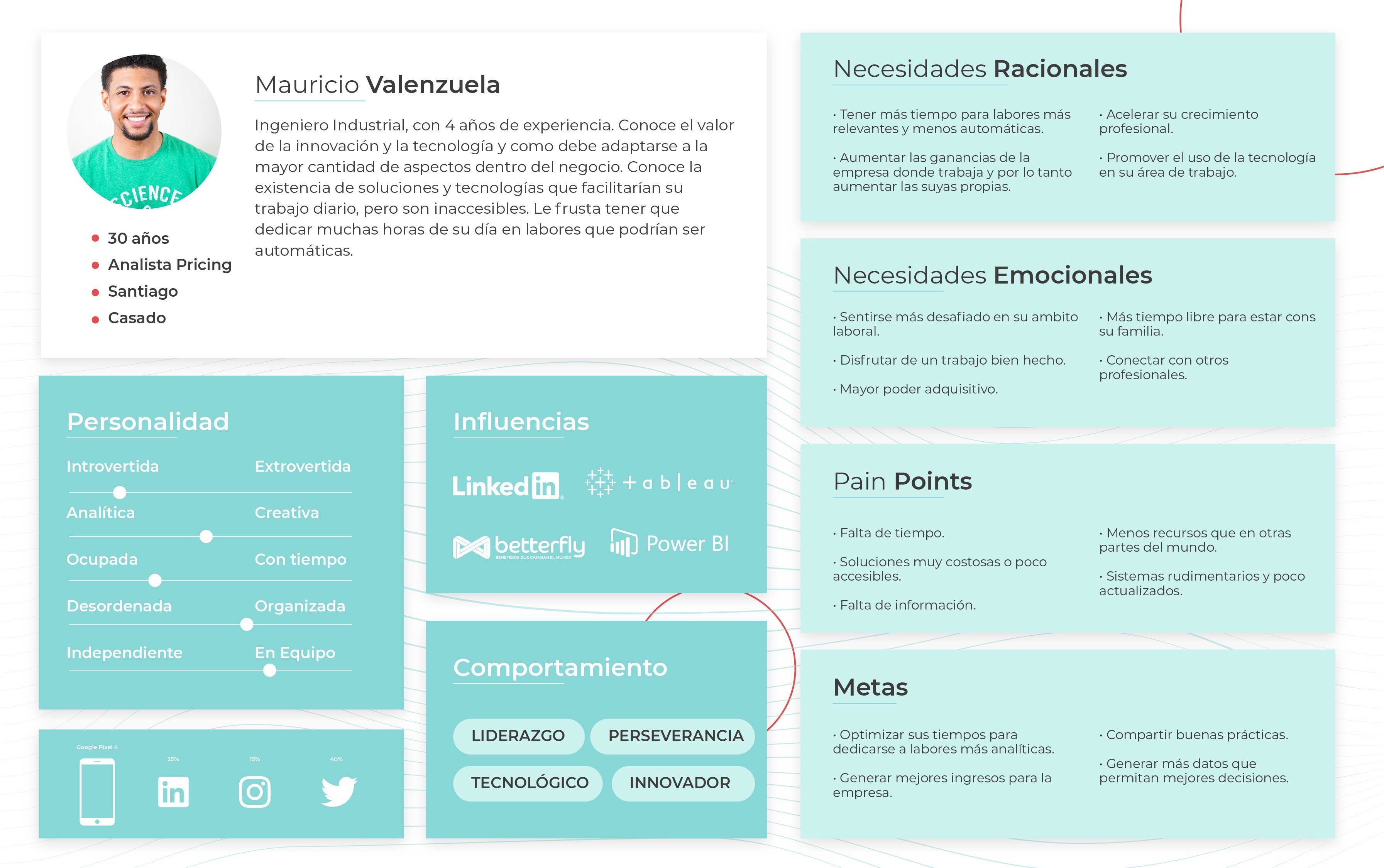 Al mismo tiempo, desarrolle un User Persona a tener en mente al momento de diseñar, basado en usuarios actuales, potenciales y algunas suposiciones debido al poco tiempo y esfuerzo destinado al research.